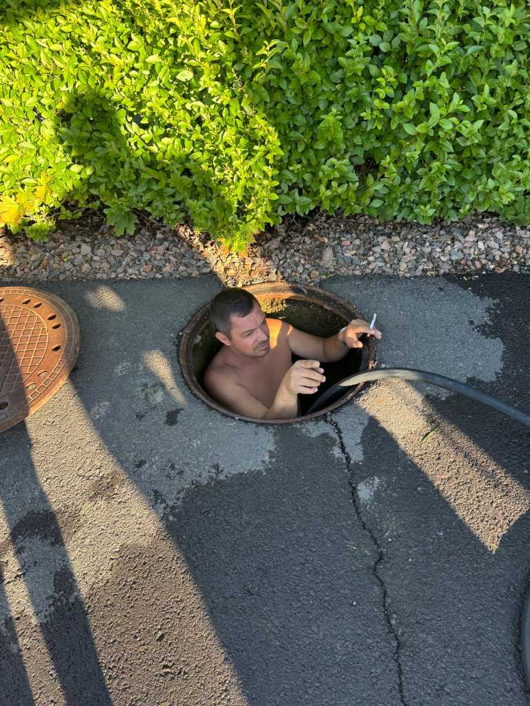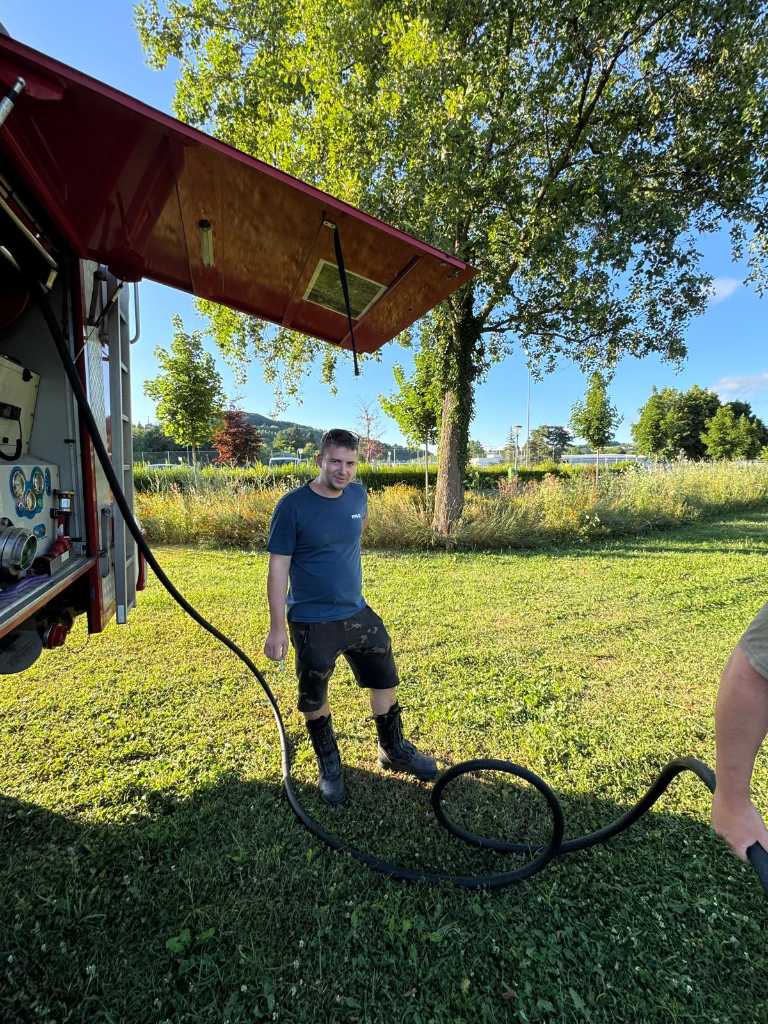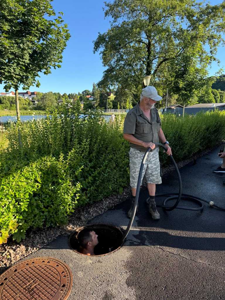 Um den Spülschlauch korrekt im Rohr zu positionieren, war ein mutiger Tauchgang von Robert Hasler notwendig. Dank seines Einsatzes und der tatkräftigen Hilfe der Feuerwehr konnte das Rohr erfolgreich freigespült werden.