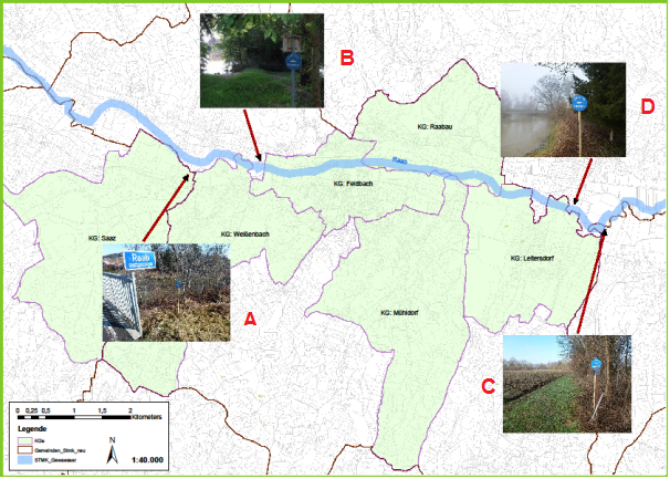 Seit 2016 kann der Raabfluss auf der rechten Seite beginnend bei der Raabbrücke in Gniebing durchgehend bis zum Ortsende von Leitersdorf befischt werden. Auf der linken Seite kann der Raabfluss beginnend beim Rückstaubecken Feldbach (Raabsee) bis zirka 70 m unterhalb der Raabbrücke in Leitersdorf durchgehend befischt werden! Bitte nehmen Sie bei der Zufahrt Rücksicht auf die angrenzenden Grundbesitzer!!! Die Grenzen sind mit roten Pfeilen und Bildern auf der Karte eingezeichnet (bitte auf die Ortsgrenzen achten, pinkfarbige Linien).